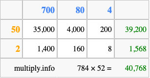 Finally, we add up all the sums we found in step 3 to get our final answer to 784 times 52.