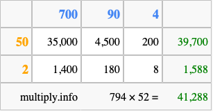That's all there is to it! As you can see from the box above, the answer to 794 times 52 using the box method is 41,288.