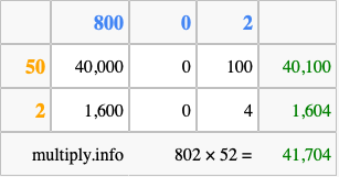 That's all there is to it! As you can see from the box above, the answer to 802 times 52 using the box method is 41,704.