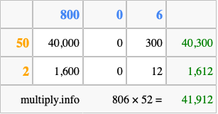 Below is an illustration showing you how to calculate 806 times 52 using the box method, using the instructions above.