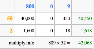 That's all there is to it! As you can see from the box above, the answer to 809 times 52 using the box method is 42,068.