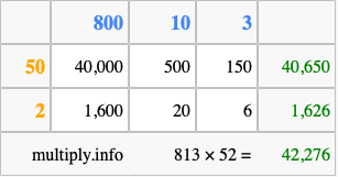 That's all there is to it! As you can see from the box above, the answer to 813 times 52 using the box method is 42,276.