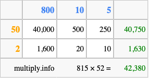 That's all there is to it! As you can see from the box above, the answer to 815 times 52 using the box method is 42,380.