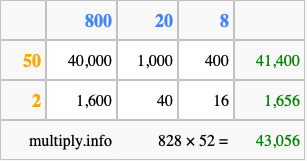 Below is an illustration showing you how to calculate 828 times 52 using the box method, using the instructions above.