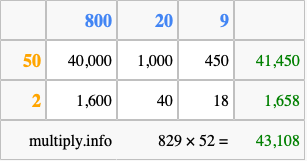 That's all there is to it! As you can see from the box above, the answer to 829 times 52 using the box method is 43,108.