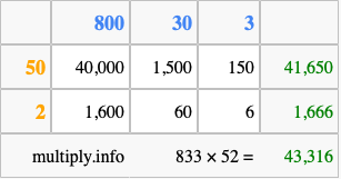 That's all there is to it! As you can see from the box above, the answer to 833 times 52 using the box method is 43,316.