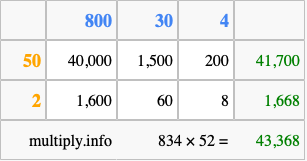 That's all there is to it! As you can see from the box above, the answer to 834 times 52 using the box method is 43,368.