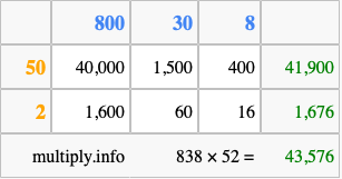 That's all there is to it! As you can see from the box above, the answer to 838 times 52 using the box method is 43,576.