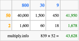 That's all there is to it! As you can see from the box above, the answer to 839 times 52 using the box method is 43,628.
