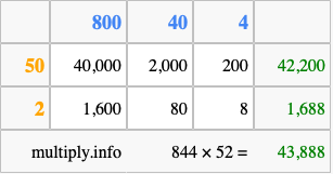 Finally, we add up all the sums we found in step 3 to get our final answer to 844 times 52.