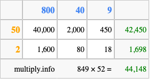 That's all there is to it! As you can see from the box above, the answer to 849 times 52 using the box method is 44,148.