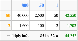 That's all there is to it! As you can see from the box above, the answer to 851 times 52 using the box method is 44,252.