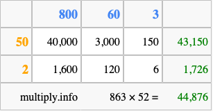 That's all there is to it! As you can see from the box above, the answer to 863 times 52 using the box method is 44,876.