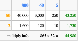 That's all there is to it! As you can see from the box above, the answer to 865 times 52 using the box method is 44,980.