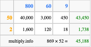 That's all there is to it! As you can see from the box above, the answer to 869 times 52 using the box method is 45,188.