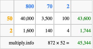 That's all there is to it! As you can see from the box above, the answer to 872 times 52 using the box method is 45,344.