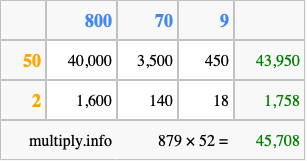 That's all there is to it! As you can see from the box above, the answer to 879 times 52 using the box method is 45,708.