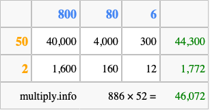 Below is an illustration showing you how to calculate 886 times 52 using the box method, using the instructions above.
