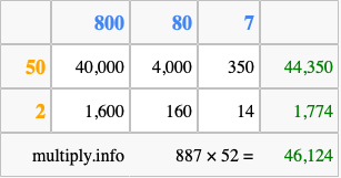 That's all there is to it! As you can see from the box above, the answer to 887 times 52 using the box method is 46,124.