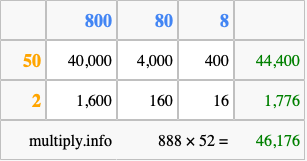 That's all there is to it! As you can see from the box above, the answer to 888 times 52 using the box method is 46,176.