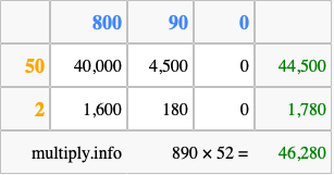 Finally, we add up all the sums we found in step 3 to get our final answer to 890 times 52.