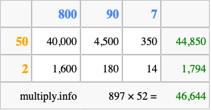 That's all there is to it! As you can see from the box above, the answer to 897 times 52 using the box method is 46,644.