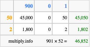 Finally, we add up all the sums we found in step 3 to get our final answer to 901 times 52.