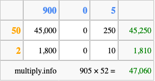 Finally, we add up all the sums we found in step 3 to get our final answer to 905 times 52.