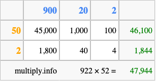 That's all there is to it! As you can see from the box above, the answer to 922 times 52 using the box method is 47,944.