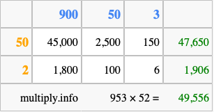 Below is an illustration showing you how to calculate 953 times 52 using the box method, using the instructions above.