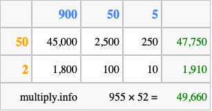 That's all there is to it! As you can see from the box above, the answer to 955 times 52 using the box method is 49,660.