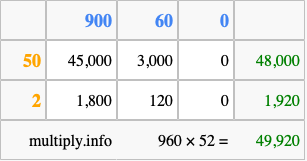 That's all there is to it! As you can see from the box above, the answer to 960 times 52 using the box method is 49,920.