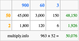 That's all there is to it! As you can see from the box above, the answer to 963 times 52 using the box method is 50,076.
