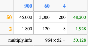 That's all there is to it! As you can see from the box above, the answer to 964 times 52 using the box method is 50,128.