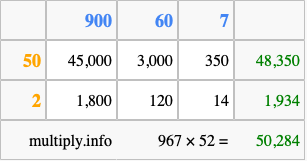 Below is an illustration showing you how to calculate 967 times 52 using the box method, using the instructions above.