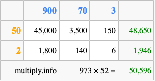 That's all there is to it! As you can see from the box above, the answer to 973 times 52 using the box method is 50,596.