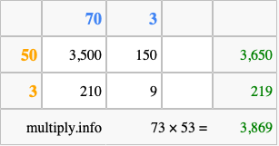 That's all there is to it! As you can see from the box above, the answer to 73 times 53 using the box method is 3,869.