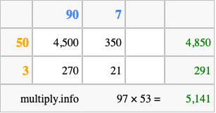 Below is an illustration showing you how to calculate 97 times 53 using the box method, using the instructions above.