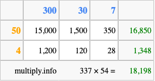 That's all there is to it! As you can see from the box above, the answer to 337 times 54 using the box method is 18,198.