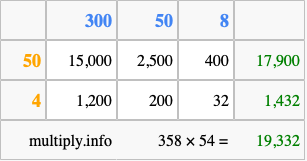 That's all there is to it! As you can see from the box above, the answer to 358 times 54 using the box method is 19,332.