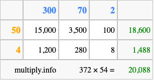 That's all there is to it! As you can see from the box above, the answer to 372 times 54 using the box method is 20,088.