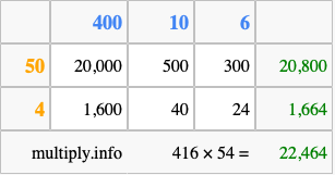 That's all there is to it! As you can see from the box above, the answer to 416 times 54 using the box method is 22,464.