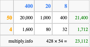 Below is an illustration showing you how to calculate 428 times 54 using the box method, using the instructions above.