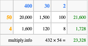 Finally, we add up all the sums we found in step 3 to get our final answer to 432 times 54.