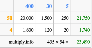 Finally, we add up all the sums we found in step 3 to get our final answer to 435 times 54.