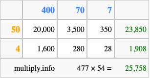 That's all there is to it! As you can see from the box above, the answer to 477 times 54 using the box method is 25,758.