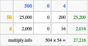 That's all there is to it! As you can see from the box above, the answer to 504 times 54 using the box method is 27,216.