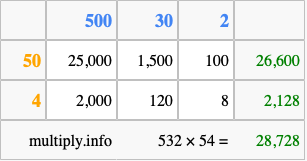 Finally, we add up all the sums we found in step 3 to get our final answer to 532 times 54.