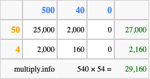 That's all there is to it! As you can see from the box above, the answer to 540 times 54 using the box method is 29,160.