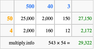 That's all there is to it! As you can see from the box above, the answer to 543 times 54 using the box method is 29,322.